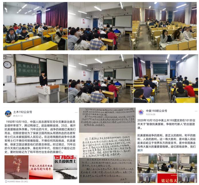 以史明志,以史育人;乘风破浪,砥砺前行。土木工程学院通过团课与主题团日活动相结合的方式,开展“致敬抗美援朝·争做时代新人”系列主题团日活动,精心组织,集中统筹指导,有针对性的分层次面向学院各年级青年开展不同活动。其中“缅怀先烈英风,回望光辉历程”系列活动引导2018级各支部成员回顾历史,缅怀英烈;“弘扬伟大精神,牢记初心使命”系列活动引导2019级各支部成员深刻体会、学习伟大抗美援朝精神;“勇担时代重任,逐梦砥砺奋进”系列活动引导2020级各支部成员坚定理想信念。(撰稿:张嘉珺、王中帅 审核:邵先锋)