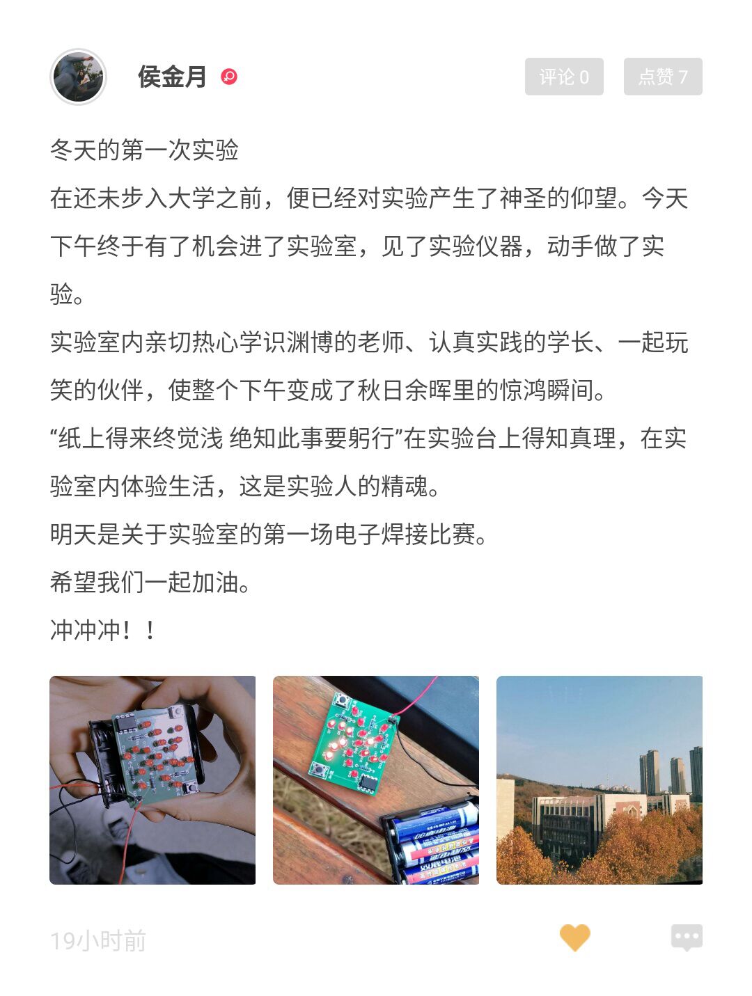 为增强学生对生活的热情,发现生活中的点点滴滴,进而充实自己的大学生活,信息与控制工程学院学生会分团委第二课堂管理处举办了“二课小纸条”之“冬天的第一…”花絮活动。本次活动以二十四节气之一的立冬为背景,以分享生活为目的,为同学们提供了一个良好的平台,参与活动的同学可以展示自己生活中的点点滴滴,也可以了解其他人生活中的喜怒哀乐。本次活动的参与者来自信息与控制工程学院各级同学,大家都积极响应,踊跃报名本次活动,活动参与度高。