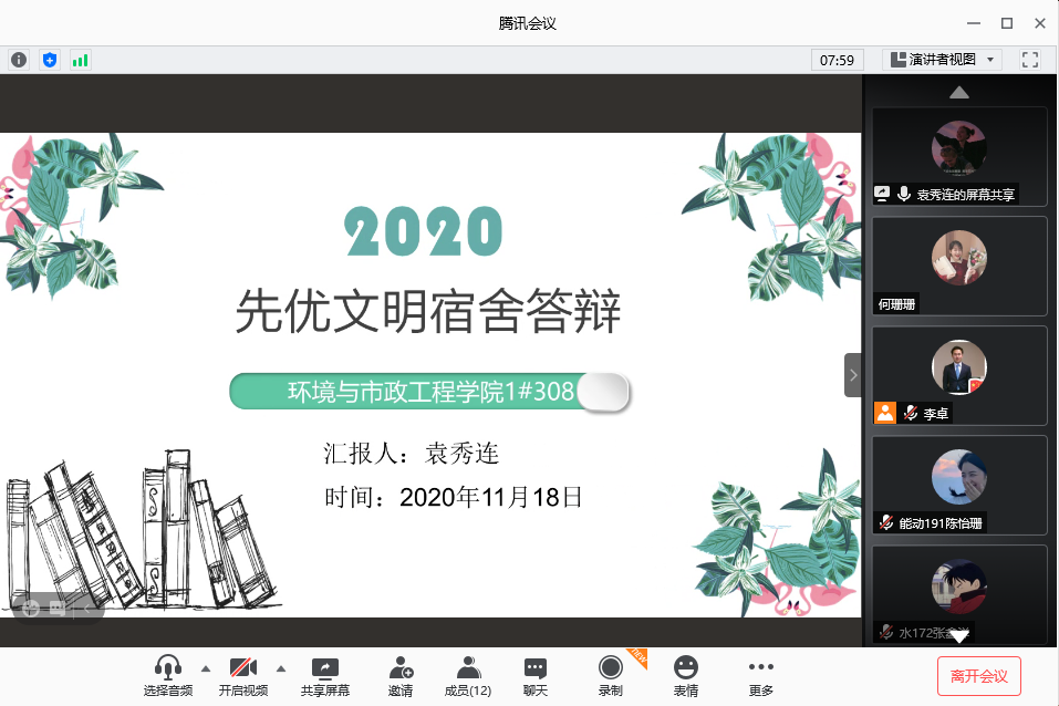 为积极践行社会主义核心价值观,加强文明公寓、平安公寓建设,环境与市政工程学院于近日通过腾讯会议举办了线上公寓先优答辩大会。党总支副书记邵长飞,辅导员李卓、何珊珊担任评委。会议由李卓主持。