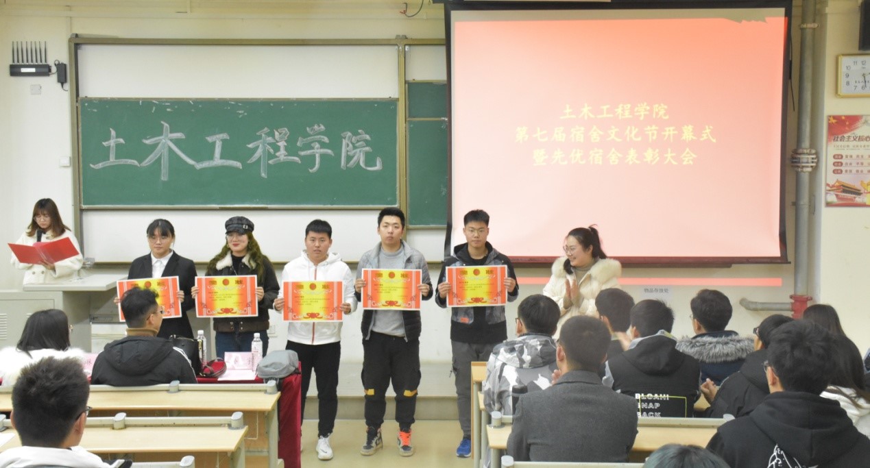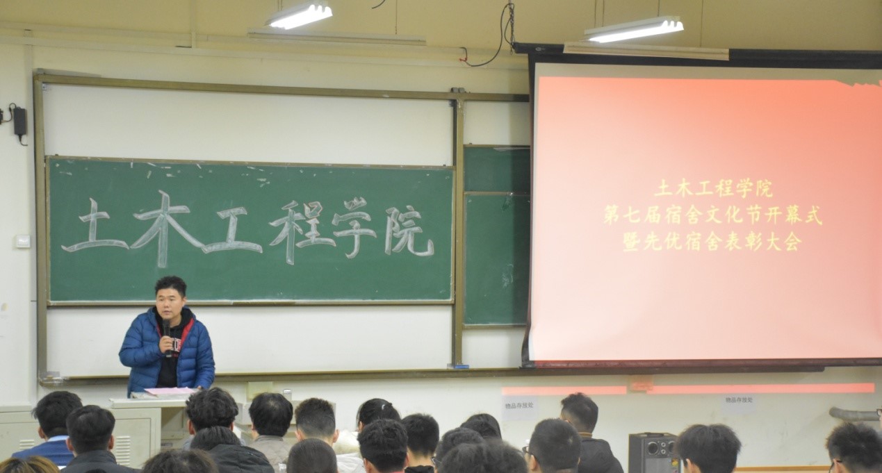 11月25日,土木工程学院于嘉陵江路校区主教学楼301教室举行第七届宿舍文化节开幕式暨先优宿舍表彰大会。学院党总支副书记邵先锋,分团委书记王中帅,辅导员杜诗琳、李恺、刘晓彤、孙宇参加开幕式。