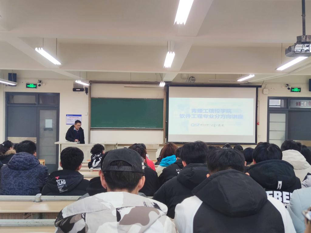 12月8日下午,信息与控制工程学院软件工程(服务外包)专业在嘉陵江路校区教学楼B404举办了分方向专题讲座。本次讲座由青软集团教学部副总监赵锦明老师主讲,青软集团驻校辅导员李健萍主持,软件工程(服务外包)专业2019级共计123名学生参加。