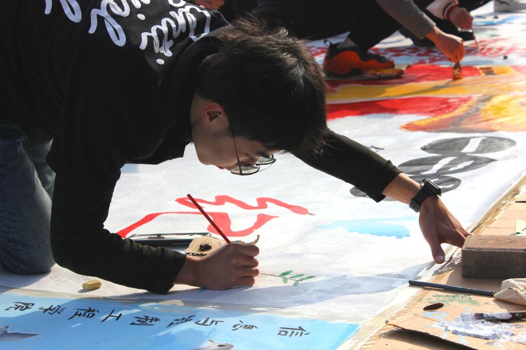 清晨的微光洒在操场上,刺骨的凉风吹不灭同学们心中的爱国热情。各院学生分工协作,打底稿,涂颜料,专注投入到绘画中,用画笔传达出对祖国浓浓的爱意。百年前,青年大学生为了祖国的未来勇敢担当奉献,莘莘学子更应学习这种精神,面对新时代的严峻挑战努力学习报效社会。