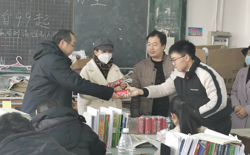 为鼓励考研同学积极应考,增强考研信心,坚定考研信念。近日,土木工程学院党总支书记曲成平、副书记邵先锋、2017级辅导员肖丽丽、刘欣然、各班班主任深入考研自习室慰问考研学子,为他们送上专门为每个考研学生定制的姓名+祝福“考研鼓劲可乐”,为考研学生加油助力。