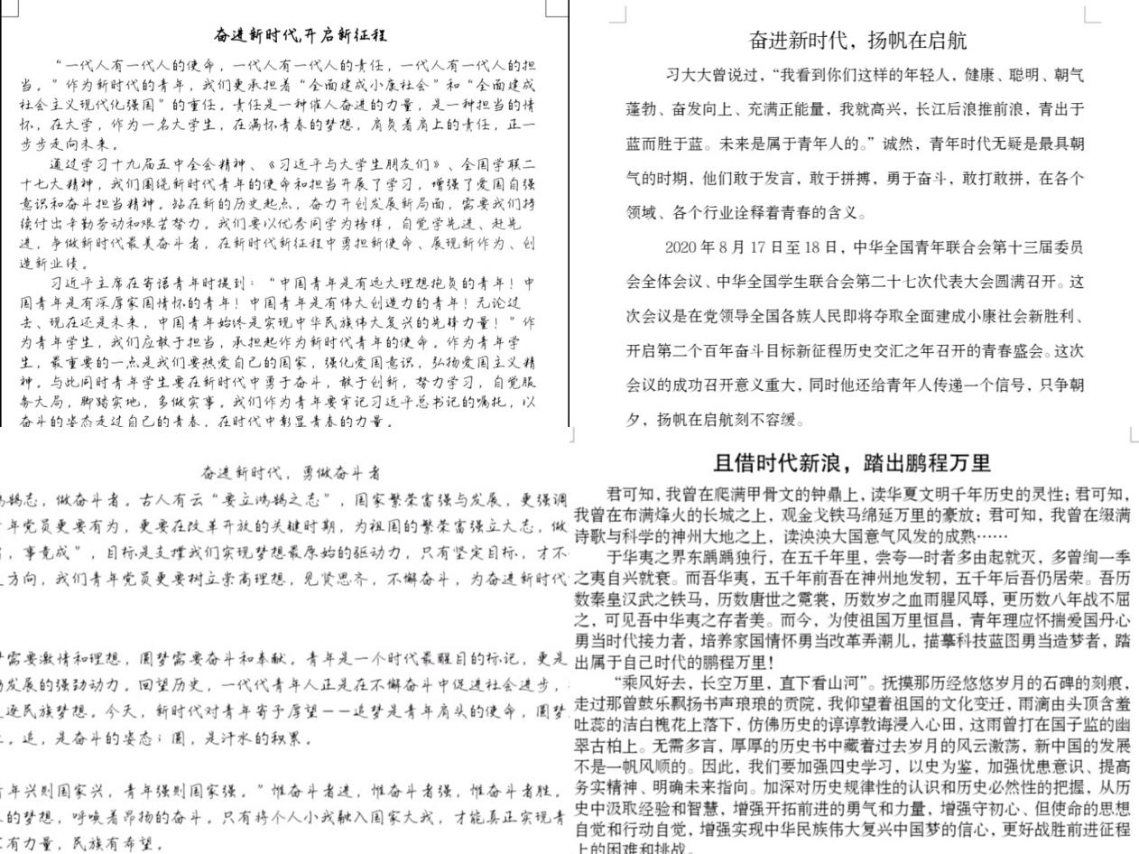 此次征文活动面向学院全体同学,由各班级团支部组织宣传,并积极组织引导班内同学参与。学习了十九届五中全会精神、《习近平与大学生朋友们》、全国学联二十七大精神等重要思想后,同学们结合自己的所感、所想、所思、所悟,书写作为新时代青年大学生的责任意识和家国担当,深刻表达砥砺前行的决心和拼搏奋斗的精神,为实现中华民族伟大复兴抒发爱国之情。