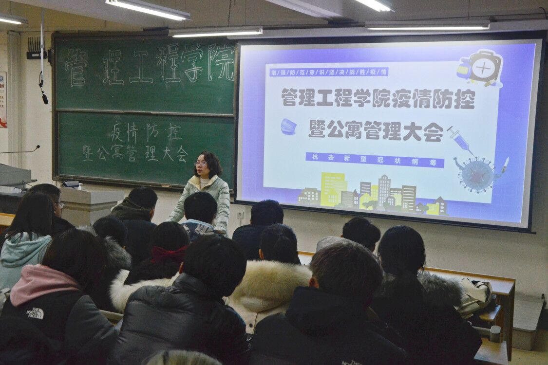 当前国际疫情防控形势日益严峻,国内疫情虽已得到有效控制,但近期国内多地出现本土新冠肺炎病例,中高风险地区上升至49处,这给疫情防控工作再次敲响警钟。为了做好期末疫情防控工作,1月6日上午,管理工程学院在主教学楼B211召开了疫情防控暨公寓管理大会,引导同学们共同捍卫疫情防控成果,携手共同维护平安稳定和谐校园。会议由辅导员张心怡主持,学院主要学生干部和舍长代表参会。