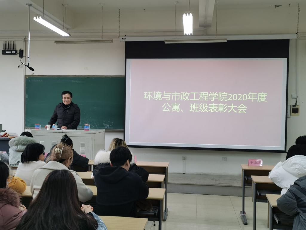 为进一步落实立德树人,提升学生班级和公寓建设管理水平,鼓励同学们锐意进取再创佳绩,1月5日,环境与市政工程学院于嘉陵江路校区主教学楼B312召开先进集体表彰会议。学院党总支副书记邵长飞、辅导员郑春英、李卓、董业硕、何珊珊、宫克菲,受表彰班级、宿舍负责人和相关学生代表参加会议。李卓主持会议。