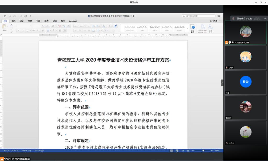 随后,许从宝对《青岛理工大学2020年度专业技术岗位资格评审工作方案》并进行了解读和工作部署,并对此次评审工作的新变化、工作时间安排、文件依据、工作方案解释及评审程序进行了梳理。他指出,在此次专业技术岗位评聘工作要提高政治站位,坚持正确价值导向,按照公平、公正、公开的原则,按照时间节点上报材料;在材料审核、工作程序、落实责任、评审纪律、材料真实性、时间节点等层面均做到“严”字当头,顺利完成此次岗位评审工作。