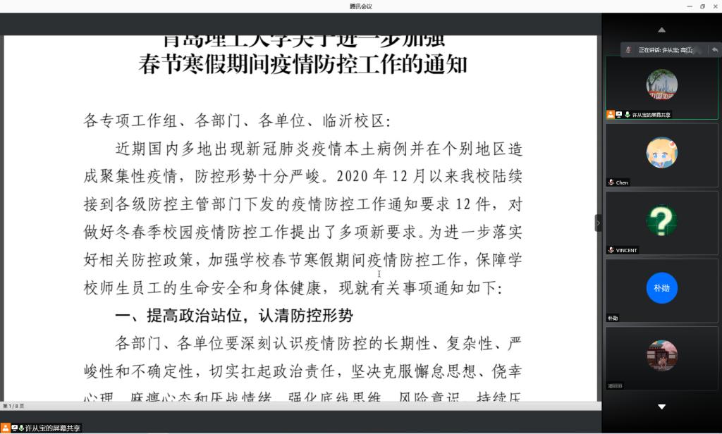 许从宝首先传达了《青岛理工大学关于进一步加强春节寒假期间疫情防控工作的通知》,就做好春节寒假期间疫情防控工作做出安排部署。许从宝强调,近期我国个别地区又出现了新冠肺炎散发病例和聚集性病例,疫情防控工作更不能松懈,务必要提高政治站位,认清防控形势,严格落实好相关防控政策,确保各项政策落地落实,做好春季学期开学相关准备工作,全体教职工务必要严格遵守学校要求,认真履责,配合学校工作。