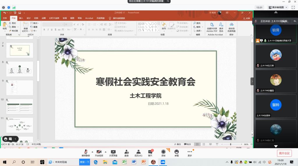 为强化学生寒假社会实践的安全防范意识,提升防范技能,进一步做好疫情防控常态化形势下学院寒假社会实践安全工作,1月18日,土木工程学院召开2021年寒假社会实践线上安全教育培训会。学院分团委书记王中帅,各社会实践团队成员参加本次会议,会议由学院分团委实践部部长吴毓倩主持。