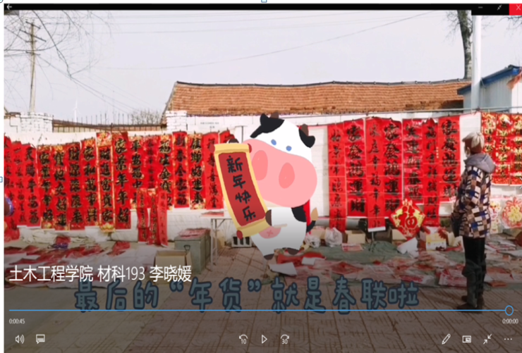 此次活动围绕“视频家书”、“一起晒年货”、“在岗过年”三大主题展开,同学们通过手机记录真实内容,表达真挚情感,让异地过年的游子通过视频说出对家人的思念和感谢,让返乡的同学晒出家乡美食和年夜饭,让坚守岗位的家长感受到家人对他们的思念和牵挂,赞扬其对国家的热爱和奉献。活动一经发出,学院同学积极参与,共征集视频作品20余篇,有的以喜庆热闹的农村大集展现热闹的忙年景象,有的以可口的美食展现浓浓的乡情。经过评选,材科193刘娇活动一等奖,材科204王文佳、土木205张云皓获得二等奖,材科193李晓媛、土木207高源、土木205杜宇航获得三等奖。