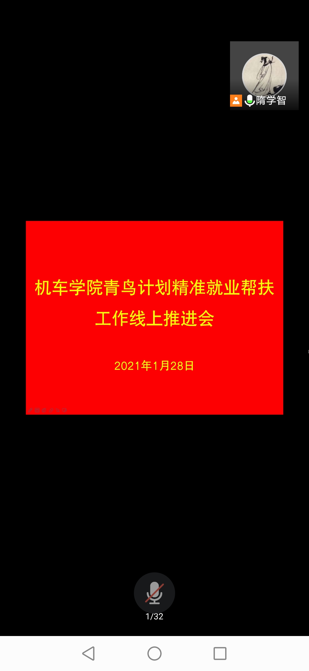 为贯彻落实党和国家“稳就业、保就业”大局工作,进一步推进落实团省委关于“青鸟计划”工作的动员部署,切实服务我院毕业生就业,1月28日下午,机械与汽车工程学院举行“青鸟计划”精准就业帮扶工作线上推进会,本次会议主要针对“难”“缓”“慢”就业毕业生,研究生处副处长宋兆珺、校团委副书记丁于娟、学院党总支副书记林海涛、学院学工办主任兼分团委书记隋学智、毕业班辅导员、主要学生干部以及就业联络员出席本次会议。