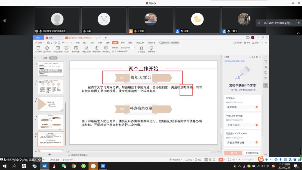 会上,各部门主要负责人通过PPT的方式汇报新学期的工作计划安排。王鹏飞指出,2021年是中国共产党建党100周年,各部门要积极策划,统筹完善建党百年系列相关活动,王鹏飞也根据每个部门的汇报内容给予针对性的评价与指导意见。王鹏飞强调,分团委、学生会各个部门之间应该加强交流,形成合力将活动做出特色、做出品质。各部门负责人也要合理规划时间,为其他部门进行下一步工作预留时间,以促进部门之间工作高效完成。