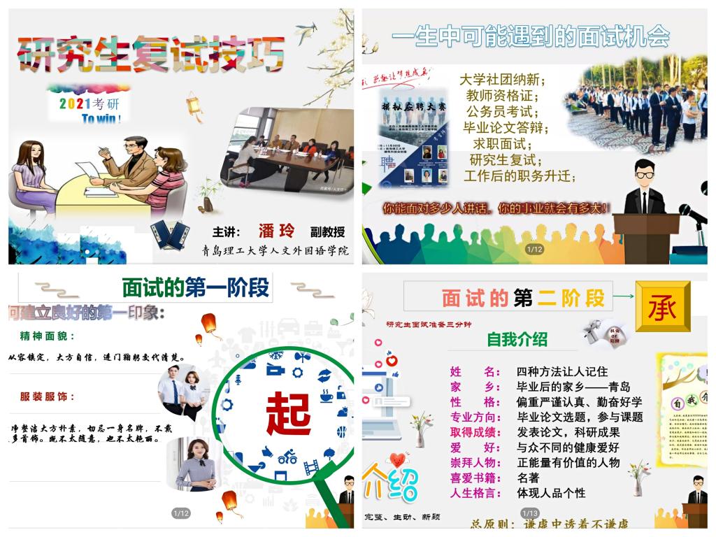 潘玲结合自身担任多年面试官的经验,从面试重要性与面试注意事项两个层面对复试进行了详细的讲解,指出研究生复试要做好礼仪、口才等“面子”工作,要提升学生语言表达的四性:流畅性、条理性、完整性和生动性。使参会同学纷纷表示受益匪浅。英语171葛得铭表示:“特别感谢学院组织这次面试培训,前期学院及时为我们开放公寓有声自习室等都为我们准备面试提供了便利条件,希望可以顺利通过面试、成功上岸!不辜负自己的努力,也不辜负学院对我们的帮助!”
