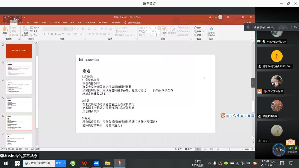 本次复试经验交流会邀请7位同学作为主讲人同大家进行交流并分享经验。他们分别是哈尔滨工业大学的张素惠、青岛理工大学的闫永、天津大学的贺子皓、南京大学的唐敏,还有来自东南大学的陈琛、“x”学姐和“圆子”学姐。