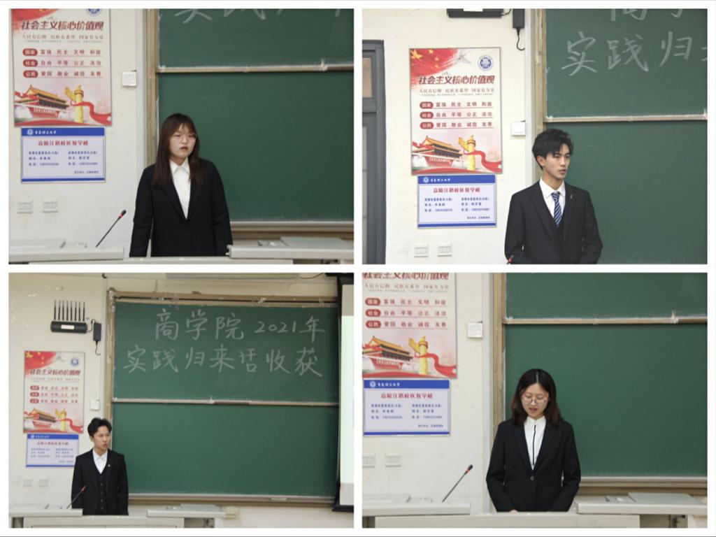 会议伊始,受表彰团队和个人代表依次发言,从实践策划、开展形式、成果介绍和心得体会等方面向大家做经验交流。远赴宁夏西吉的“心怀国家,脚踏热土”西吉金豆智脱贫队代表栾天翔,从具体实践助力农业脱贫行动进行分析,给大家分享了一项完整的实践活动总体规划;“菏”家幸福队代表马天淇以团队社会实践调研报告为例,主要介绍参与实践的前期准备和实践报告撰写格式。闫雪瑞和牛涵玉分别交流青鸟计划的实践经验和参与“希望小屋”志愿服务的心得体会,在慰问失独家庭、孤寡老人以及“希望小屋”的孩子们的过程中走入基层,通过与老党员的对话“自选择从政为党为人民的那一刻起,我从来没有后悔过”,感悟到中国共产党自成立以来就肩负着实现中华民族伟大复兴的重任,而中国共产党党员则是引领国家和人民走向富强安康的中坚力量。商学院青年学子们从“汲取”成长为“给予”,不断发扬理工精神,承担历史使命,做中国特色社会主义的坚定信仰者、忠实实践者,矢志把青春融进祖国的江河大地,在全面建成社会主义现代化国家的非凡答卷添上美丽画笔。