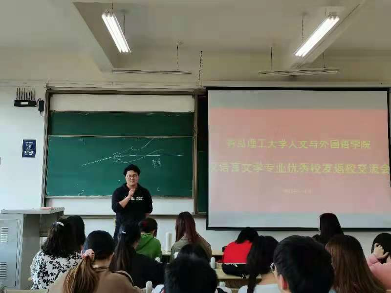 赵灿结合自身学习、创业和成长经历,情真意切地为同学们提出了很多切实可行的良好建议。他特别强调在校期间知识文化学习和社会实践对未来就业的重要性;分析了汉语言文学专业的就业前景,鼓励同学们面对激烈的社会竞争必须学会审视自己,努力培养自身优势,提高自身竞争力;他表示态度非常重要,要努力做好每一件事,大学生要勇敢尝试,在成长中提升自我,提升自身各方面的技能。