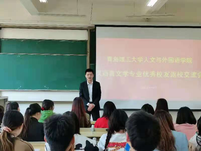4月8日,人文与外国语学院汉语言文学专业在主教学楼举办第三场优秀校友返校交流会暨社会实践基地授牌仪式。人文与外国语学院党总支副书记王振,汉语言文学专业教研室主任、民俗文化研究所所长张成福,汉语言文学专业2017届优秀毕业生赵灿、2019届优秀毕业生刘松以及汉语言文学191班全体同学参加活动。张成福主持活动。
