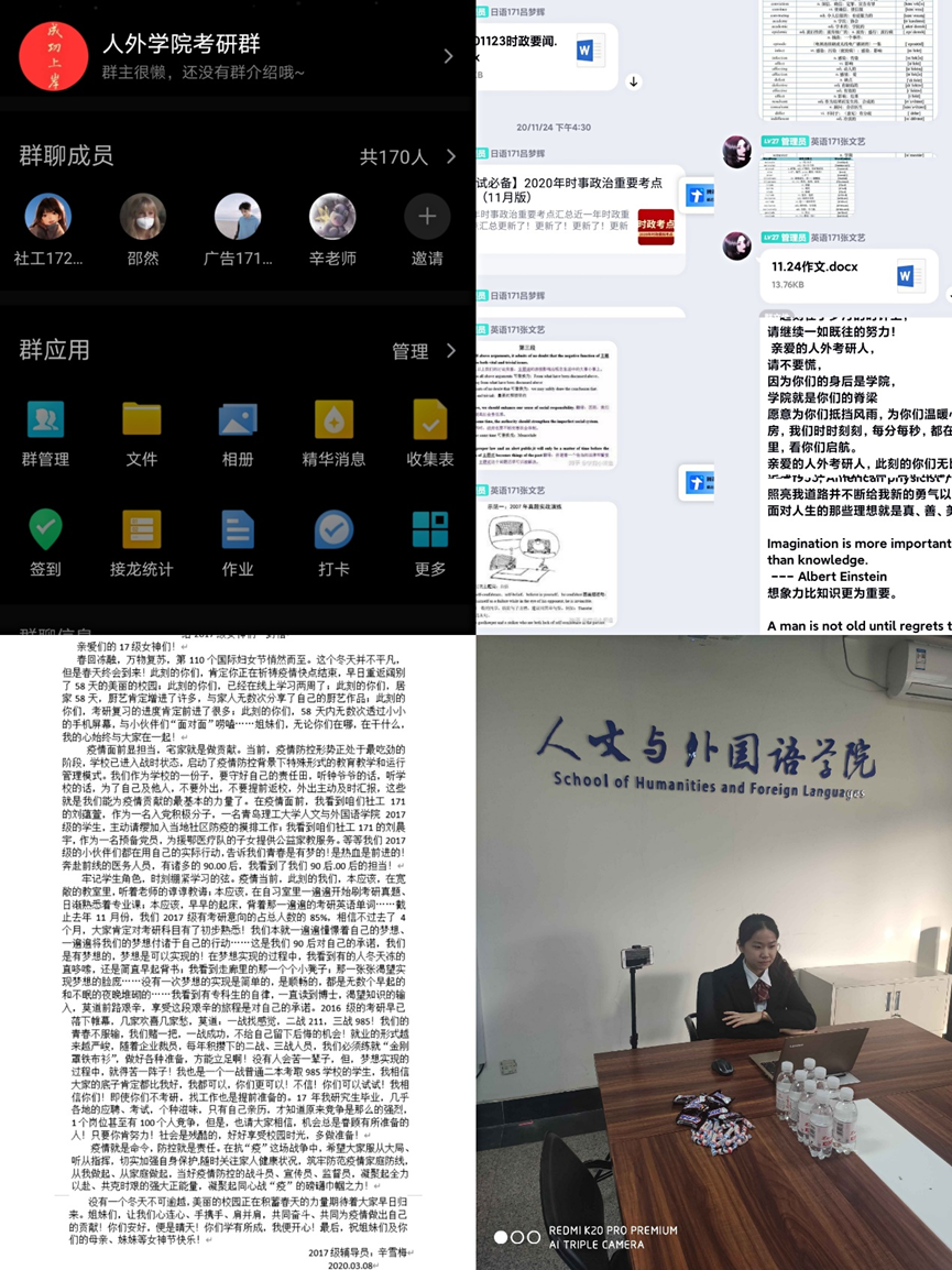成绩的取得同时离不开全体老师的悉心教导。面对疫情影响,学院为考研学生多次提供专业性的指导和全方位的服务,开展多种形式的考研动员宣传,通过设立考研自习室、举办考研辅导讲座和经验交流会等方式,形成“全员关注学生考研、全员参与学生考研、全员助力学生考研、全员服务学生考研”的良好氛围。考研前夕,学院领导情系考研学子,给考研学子送祝福,助力学子坚定考研信念;复试前夕,学院整合资源,多次召开导师复试指导培训会、学生考研复试培训会;众多任课老师牺牲自己的休息时间为同学们答疑解惑,对报考同学给予耐心指导;为学子提供远程复试教室,助力考研学子“云复试”……广告172班范靖文表示:“学院能够高效并细致地解决考研学生的困难,让我们觉得考研路上得到很多帮助和支持,感到特别温暖。”