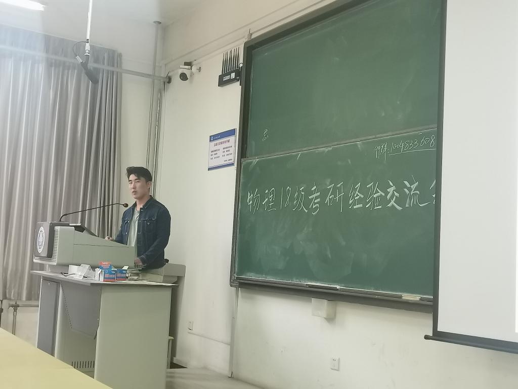 接下来,应用物理专业考研成功的各级同学代表依次发言,分享了他们的考研经验。物理16级考取青岛理工大学研究生的王一诺同学,从考研目标学校选择,考研心态和情绪以及计划安排等三个方面为同学们提供了重要建议;物理16级考取青岛理工大学研究生的董延清同学从考研的意义和如何备考等几个方面分享了宝贵经验;物理17级考取东南大学光学方向的牛得洋同学阐述了考研努力与坚持的重要性,并分享了各科目的备考经验和重要资料;物理17级考取南京大学凝聚态方向的刘芝同学,从考研目标学校的选择、自我定位和备考的经验等方面和同学门分享了非常有价值的经验;物理17级考取华南师范大学量子信息方向的宋鹏飞同学建议认清学科和专业的特点,结合自身学习情况和兴趣爱好报考学校,选择合适方向。物理17级考取华东师范大学光学专业方向的李纳川同学从学校选择,考研准备和日常生活节奏调节等方面为同学们提供了非常有价值的参考。最后通过线上链接考取华南师范大学研究生,目前就职于深圳华星光电有限公司的王承龙同学,从研究生的工作优势以及对人生的锻炼等多个方面阐述了考研究生的重要意义。因工作原因不能参加的优秀毕业生同学也精心制作了经验材料,为同学们提供了重要参考。