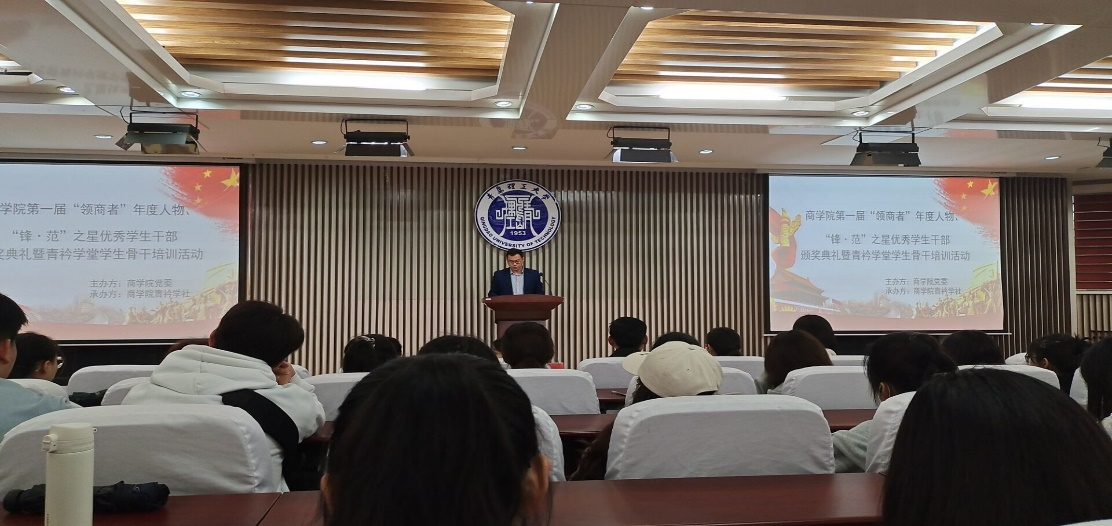 为深入挖掘和宣传商学院校友,在校大学生先进典型,形成榜样模范示范引领作用,促进全体学生的健康成长。5月12日下午,商学院在1号教学楼1楼东报告厅举办了第一届“领商者”年度人物、“锋·范”之星颁奖典礼。本次活动由商学院学生社团青矜学社承办,商学院党委副书记董兰国、辅导员薛诚、冯宁、宋颖、刘奕、姜忠泰、石路捷以及各年级学生代表共计300余人参加了颁奖典礼。