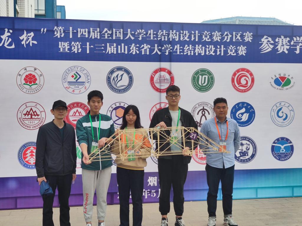 大学生结构设计竞赛为教育部确定的全国九大学科竞赛之一,享有“土木皇冠上最璀璨的明珠”之称,山东省大学生结构设计竞赛作为全国大学生结构设计竞赛分赛区,旨在加强省内土木专业各高校师生间的合作交流,激发大学生的创新意识,培养大学生的实际分析和动手实践能力,提高大学生的综合素质。比赛分为计算书撰写、模型制作及模型加载三个环节,既有理论计算,又有动手能力展现,还有现场加载展示环节,考验了参赛队员的综合实力。