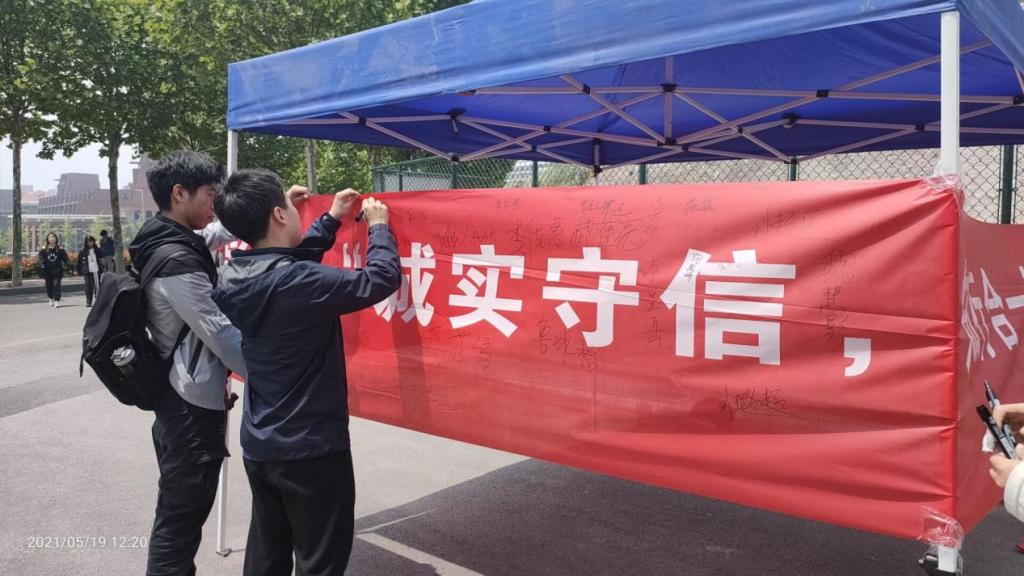 同学们广泛参与,纷纷签下自己的名字,并表示不管是在日常生活还是在学术、考试以及偿还助学贷款等方面都会做到诚实守信,知行合一。