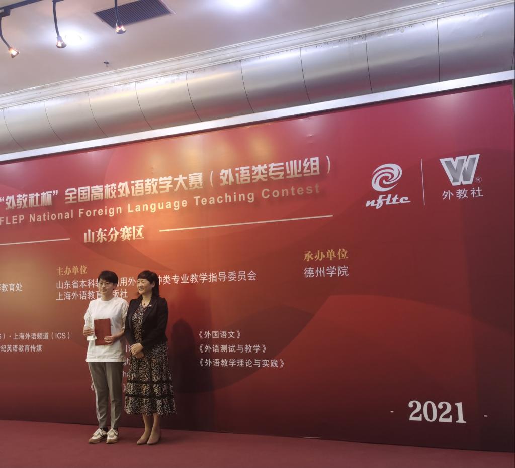2021年第十二届“外教社杯”全国高校外语教学大赛山东分赛区举办英语专业组和商务英语专业组两个组别的比赛,由山东省教育厅高等教育处指导、山东省本科教育通用外国语种类专业教学指导委员会和上海外语教育出版社联合主办。来自省内48所高校的75位选手参加,可谓高手云集。经过初赛、复赛和决赛三轮次较量,我校人文与外国语学院英语专业李娇、李爱晶两位老师脱颖而出,在本次比赛中取得历史最好成绩,获得英语专业组特等奖的李娇老师将作为山东省唯一代表参加今年11月在上海举行的全国决赛。