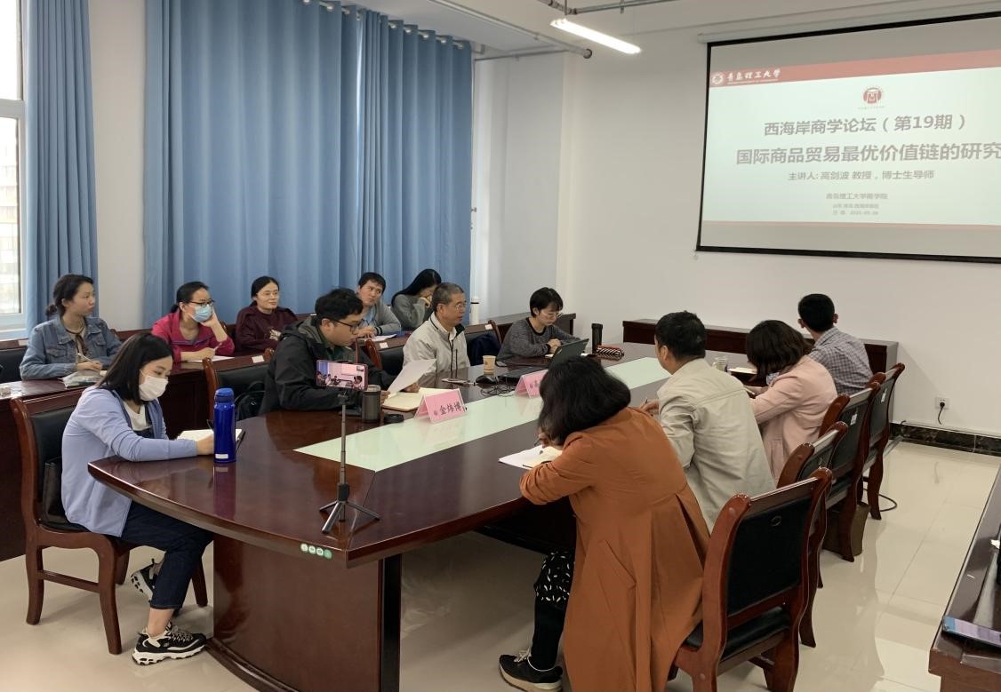 5月26日下午,第19期西海岸商学论坛在商学院411会议室举办。本期邀请北京师范大学高剑波教授担任主讲,主题为“国际商品贸易最优价值链的研究”。商学院相关专业教研室教师和研究生通过线上和线下等方式参加会议,院长助理金炜博主持会议。