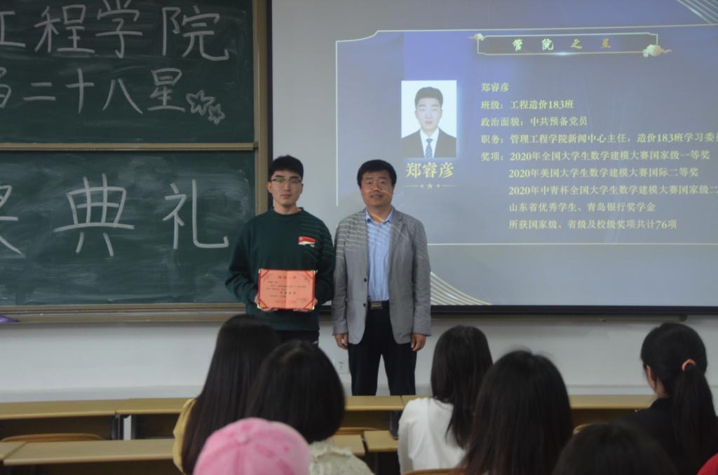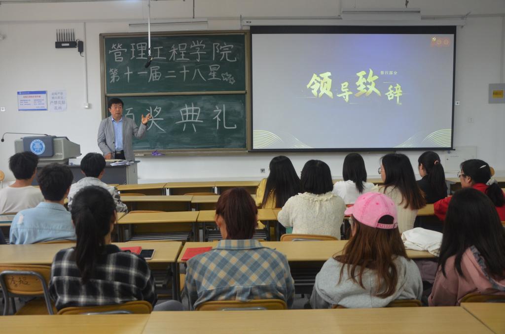 为树立先进典型,发挥榜样示范和朋辈引领作用,6月2日下午,管理工程学院于嘉陵江校区C1-2楼301教室举办第十一届群星璀璨之“管院二十八星”颁奖仪式,党委副书记于利俊,学工办主任兼分团委书记陈永亮、2019级辅导员李佳妮、张冯冯及二十八星全体获奖学生参加仪式。活动由李佳妮主持。