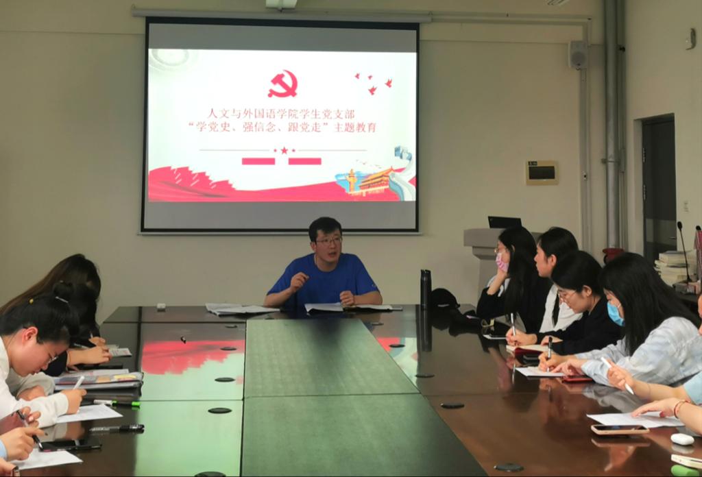 为贯彻落实立德树人根本任务,进一步开展2021届毕业生党员文明离校专题教育,引导广大毕业生党员了解党的光辉历史、感悟党的初心使命,激发毕业生党员爱党爱国热情,人文与外国语学院学生党支部于6月22日下午举行“学党史、强信念、跟党走”主题教育座谈会。会议由人文与外国语学院学生党支部书记陈刚主持,全体毕业生党员参会。