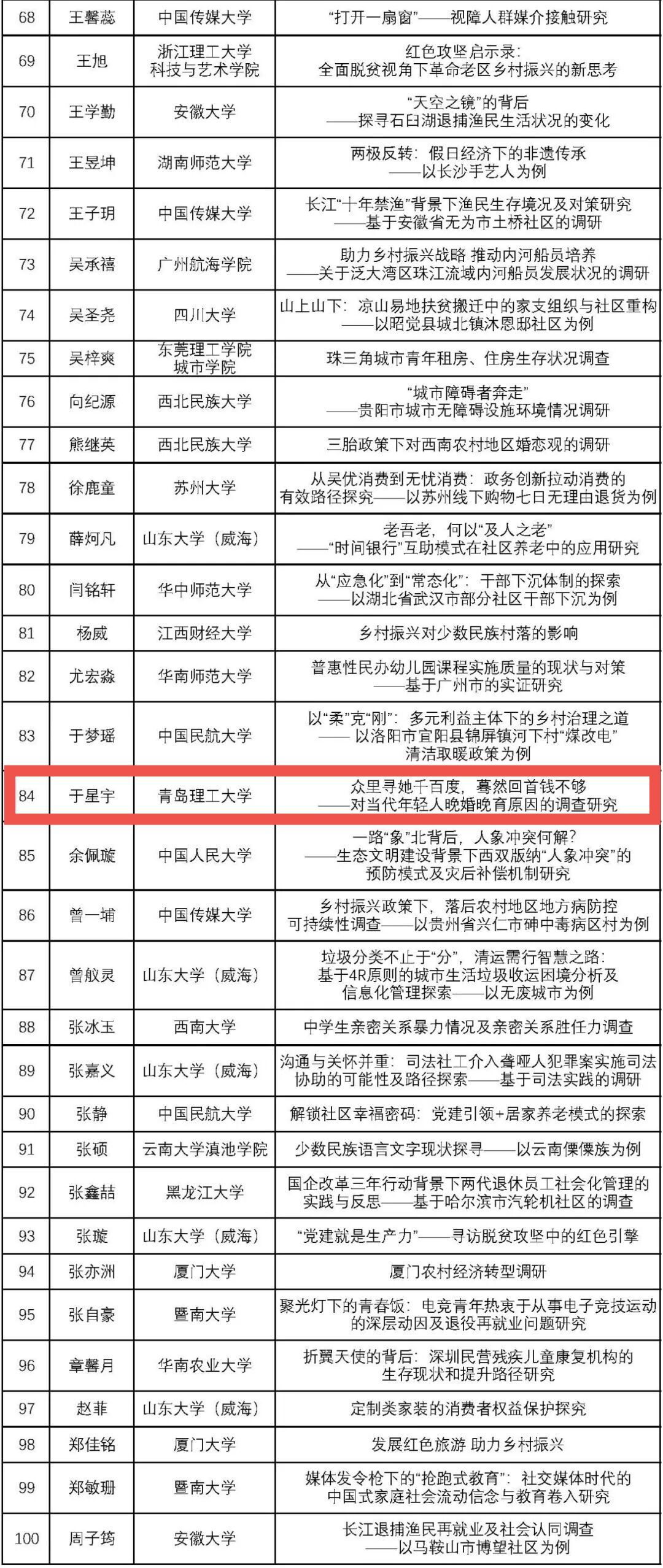 近日,2021年《南风窗·调研中国》活动结果揭晓,正式公布了入选2021年“调研中国”项目全国百强的团队名单,我校管理工程学院管科208班于星宇同学申报的调研项目《对当代年轻人晚婚晚育原因的调查研究》成功入选,成为2021年“调研中国”百强队伍,并获得调研资格。