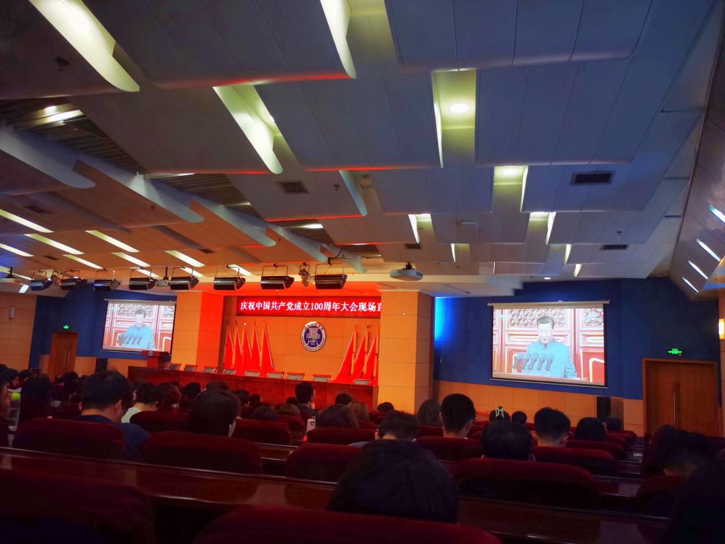 7月1日上午,庆祝中国共产党成立100周年大会在北京天安门广场隆重举行,中共中央总书记、国家主席、中央军委主席习近平发表重要讲话。艺术与设计学院组织全体学生共计800余人分别在一教300阶、400阶、500阶、市北校区报告厅收看大会直播。