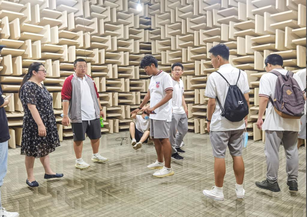 研学过程中,参与研学的同学参观研究了系列建筑设计作品,学院学生会志愿者针对优秀作品的设计理念与设计内涵和参与学生进行了生动有趣的分享,研学同学对建筑模型的精密程度赞叹不已,一个个严谨细致的模型也从呈现了建院学子脚踏实地、扎实肯干的优良学习作风。在营造实验室与声光实验室中,程然将建筑营造设计、木艺技术及从从材质加工处理到组合安装进行了示范讲解;于红霞带领同学们近距离地体验到建筑设计中声光的搭配选择到声光与环境的融合贯通。