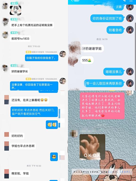 面对崭新的生活环境,如何更好地适应新环境,是大学新生入学重要地问题。学院为每一个新生宿舍配一位高年级学长学姐,对新生“一对一”服务,“面对面”沟通,关心新生生活,关注新生动态。因疫情影响,省外新生返校后需到宿舍隔离,宿舍学长学姐以线上方式在新生隔离期间用自己的关心和热情,让远在家中的家长放心,也让独立进校适应校园生活的新生们感受到家的温暖。