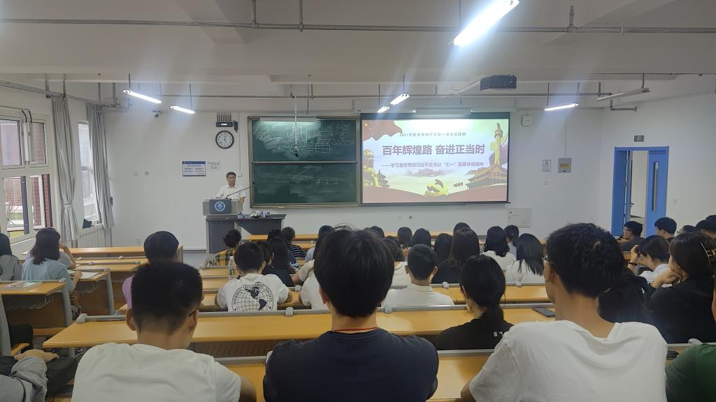 为深入贯彻学习习近平总书记在庆祝中国共产党成立100周年大会上的重要讲话精神,提高研究生的政治认同、家国情怀和道德修养,9月6日下午,管理工程学院在嘉陵江路校区2号教学楼202教室开展研究生新生开学第一课,学院党委书记李洪民主讲,学院团委书记、学工办主任宋晓峰和全体2021级研究生新生参加。