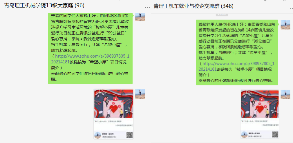 学院团委将“希望小屋”的情况简介以及腾讯公益募捐活动的详情推送到学院教师交流群、毕业生校友群以及用人单位工作群等多个渠道,用心讲好希望小屋故事,积极吸引爱心人士参与募捐活动。学院党政领导、专业教师、毕业生校友、用人单位HR纷纷参与到募捐活动中,其中有2名爱心人士的单笔捐款达到200元。