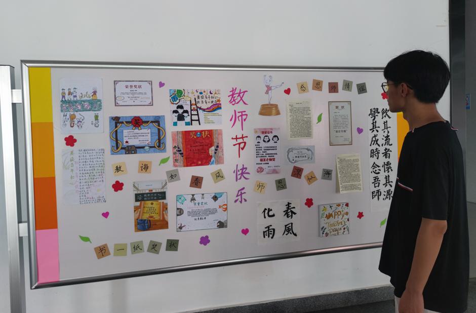 教师节当天,特意于商院大楼设立展牌,将活动中的优秀作品展出,供老师们欣赏。他们看到书信和奖状,感受到学生对自己工作的肯定,辛苦也化作一捧暖意流过心头,师生情在心与心的交流中悄悄流露。薛诚老师驻足展板,满心欢喜,感受到同学们的爱戴。他说道,“同学们的用心我看到了,也感受到了他们对老师们由衷的感谢。”“丹心映日月,赤诚浇新花”,老师们敢于担当起立德树人之大任,便值得千般万般赞誉。