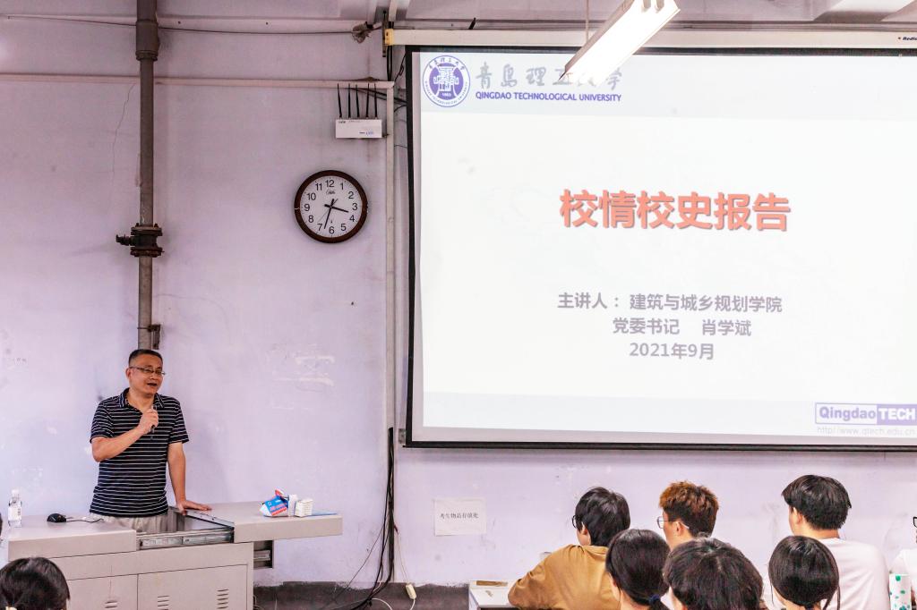 为促进新生入学教育的开展,帮助2021级新生快速适应大学生活,树立正确的目标,培树同学们的爱国荣校意识和家国情怀,9月23日,建筑与城乡规划学院于一教200阶开展2021级新生入学系列教育之校史院情讲座,本次讲座由学院党委书记肖学斌主讲,全体2021级新生参加。