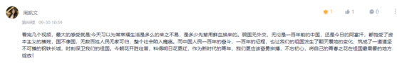随后,一段金沙滩啤酒城7月16日上演的青岛啤酒节开幕式狂欢短视频让大家热血沸腾,对这座将生活四年的“青春之岛,活力之城”充满了向往。而《1950,他们正年轻(那兔版)》的短视频则将大家带回到冰天雪地中的抗美援朝战场。刘亚鹏让大家在学习通主题讨论区留言,贾立武写到,“看到阿富汗机场的惨状,中国百年前惨遭凌辱,让我想到真正的当一个国家强大时,才会有话语权,才在国际上有地位,所以我们这一代,更要为中国的建设做出努力,把祖国建设的更加繁荣,更加美丽”。