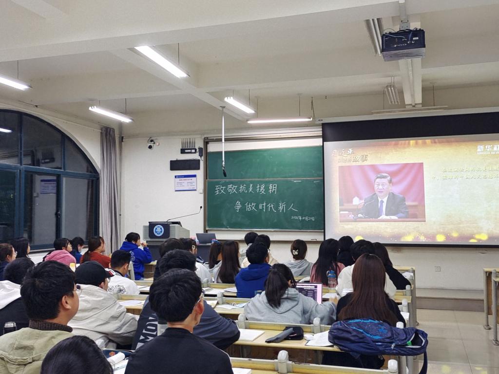 主题班会重温习近平总书记重要讲话精神。数学211班团支部于10月20日在主教学楼召开“致敬抗美援朝,争做时代新人”主题班会,再次重温习近平总书记在纪念中国人民志愿军抗美援朝出国作战70周年大会上的讲话,团支部书记、副书记用生动的语言结合精美的PPT采用倒序方式通过老兵李化武的视角带领同学们进一步了解那段难忘的历史。陈家文同学说道:“今天的幸福生活来之不易,和平年代我们更应当铭记历史,缅怀先烈,守好自己的学习主阵地,自律自省,力争上游。”