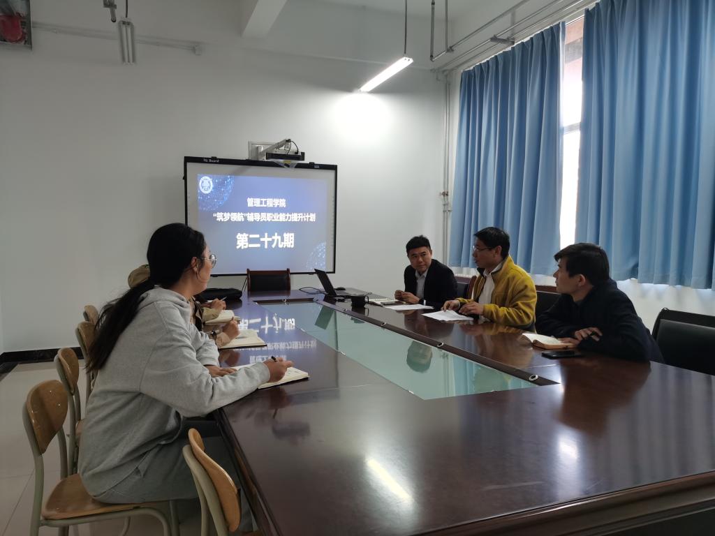 10月25日, 管理工程学院于C1-2-311会议室举办第二十九期“筑梦领航”辅导员职业能力提升工程。学院党委书记李洪民,学生工作办公室主任、团委书记宋晓峰及全体辅导员参加会议,会议由学院党委副书记王中帅主持。