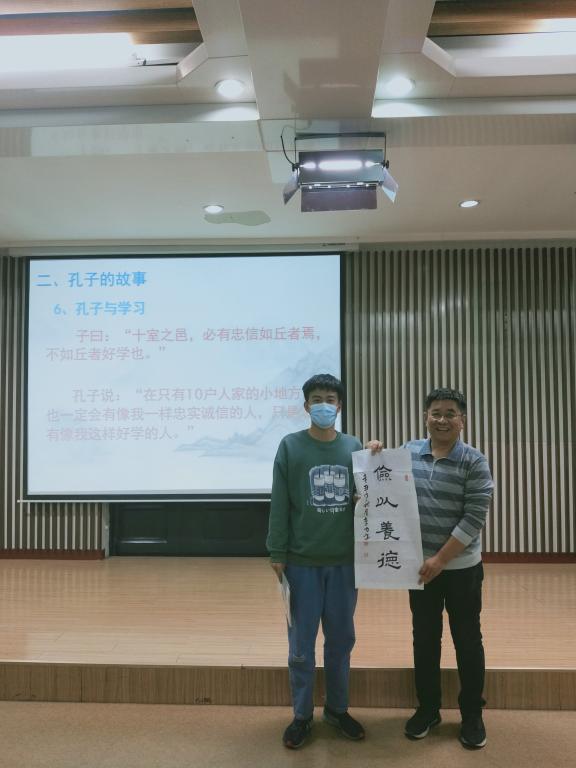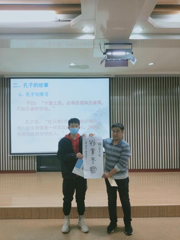 互动环节,李力耐心解答同学们提出的问题并为同学们准备了八幅书法作品。他以“孔子相师”“两小儿辩日”等故事为例教导同学们“三人行必有我师焉”,生活中不仅要勤奋好学,更要谦虚好学,引起在场师生共鸣。李老师的讲座自始至终吸引着师生们的眼球,报告最后他特意呼应课堂开始内容,再次强调了习近平总书记在曲阜考察时的重要阐述,呼吁同学们把马克思主义基本原理同中华优秀传统文化相结合,博览国学经典,坚定理想信念、增长知识才干、积淀人文底蕴。