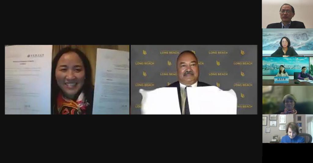 近日,我校参加了青岛市与美国长滩市举办的友城视频连线交流活动并与加州州立大学长滩分校签署合作意向书。驻洛杉矶总领馆副总领事施远强,省委外办副主任、省对外友协常务副会长李荣,市外办副主任真珠、长滩—青岛友城委员会代表、加州州立大学长滩分校助理副校长Dr. Jeet Joshee、我校国际交流处处长周红燕等近50人在线出席活动,长滩市市长罗伯特·加西亚录制视频出席。