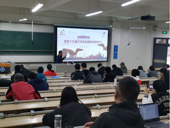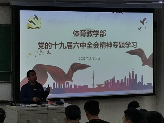 11月17日下午,体育教学部在嘉陵江路校区一号教学楼B125召开党的十九届六中全会精神专题学习会。会议由体育教学部主任王龙主持,全体教职员工参加学习。