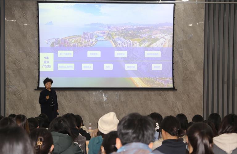 刘雯从西海岸新区深厚的历史底蕴、独特优良的自然禀赋、便捷通达的交通体系、雄厚完善的产业基础、优质丰富的创新资源等方面,对青岛西海岸新区做了深入全面的介绍,指出西海岸新区具有自然、区位、人才等优势,承担经略海洋、协同创新、自贸区建设、国家级新区体制机制创新四大国家战略,形成了影视之都、音乐之岛、啤酒之城、会展之滨等熠熠生辉的四张名片。刘雯立足山东省委省政府“十强产业”发展布局、青岛市委市政府“十五个建设攻势”高度,从新区“四新”经济发展工作入手,为青岛理工大学及商学院在西海岸新区发挥高校智力优势和人才优势,融入属地发展,推动校城合作,加强新经济产业链与学院学科建设的合作尝试提出了指导性建议。最后,刘雯从学生个人职业发展规划切入,围绕西海岸新区青年人才需求、产业发展趋势、生活美好宜居等方面,鼓励学生主动融入地方发展,为西海岸新区的发展做出青年贡献。整场报告视野宽广、内涵丰富、见解深刻、指导性强,学生边听边记、受益匪浅。