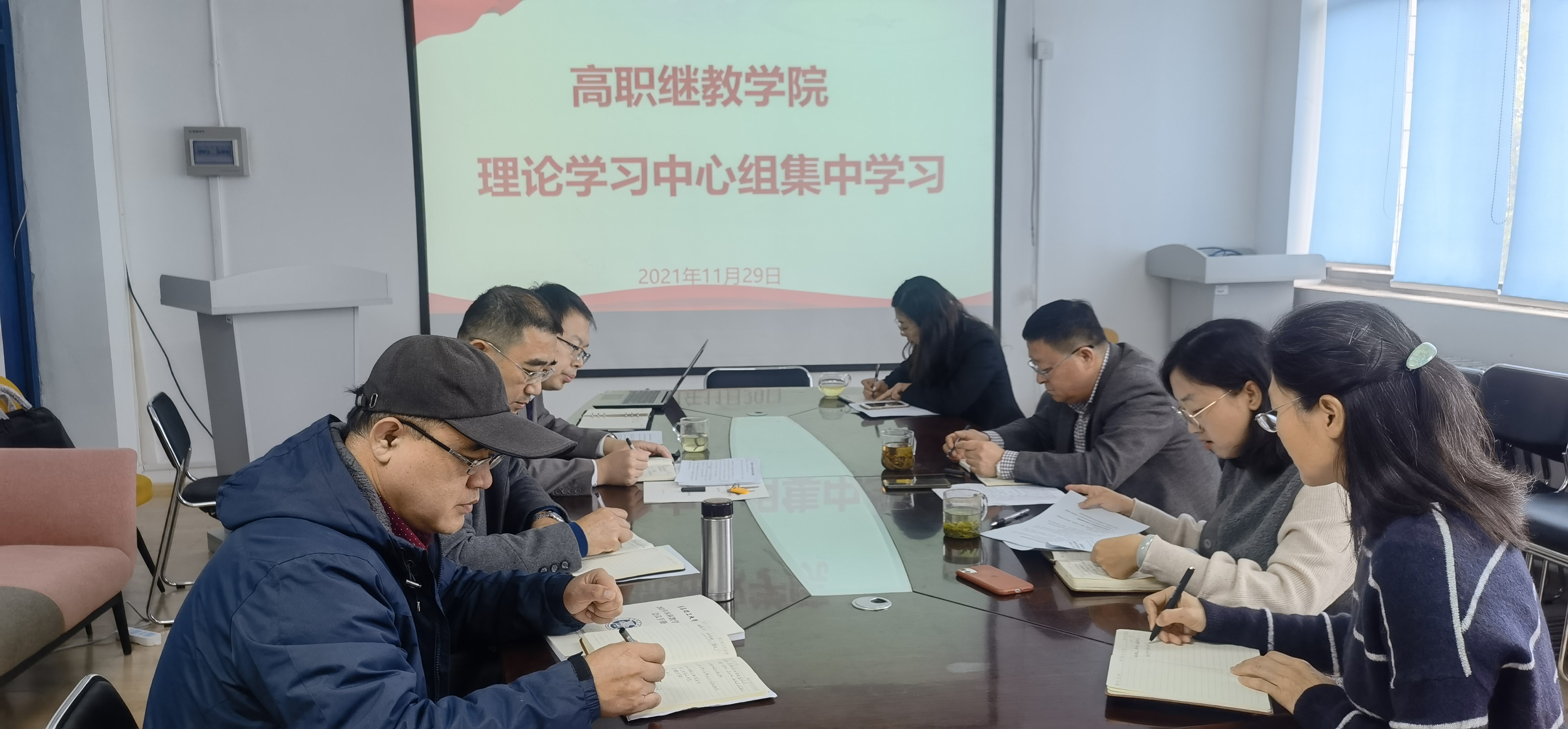 11月29日上午,高职继教学院理论学习中心组在市北校区学院会议室开展十九届六中全会精神集中学习。学院党总支书记孟凡勇主持学习并讲话,总支理论学习中心组成员参加学习。