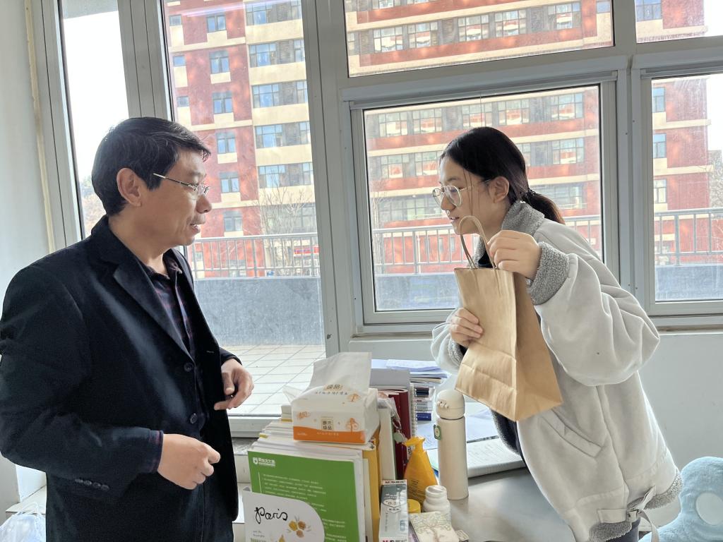 李洪民及全体辅导员老师来到考研自习室,将学院精心准备的300余个暖心考研“福袋”送到考研学生手中。并鼓励考研学子在复习的关键阶段,要坚定必胜信心,保持良好心态,科学作息,规律饮食。礼袋里“连中三元”系列文具寓意考研同学一战成功、金榜题名;脐橙,寓意考研同学能够心想事“橙”、“橙”心如意;牛奶,希望能给考研同学补充营养,让同学们感受到考研路上充满温暖。同学们看到老师们亲手送来的礼物感到十分惊喜和温暖。
