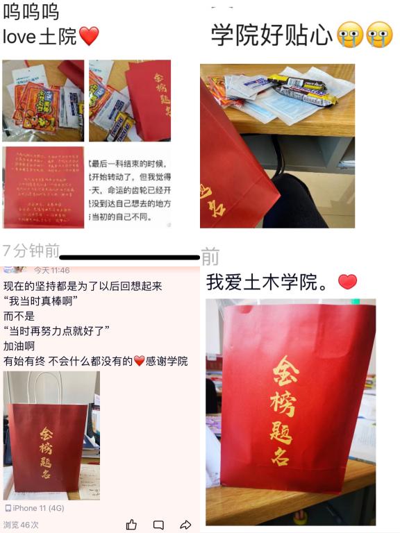 收到礼包的学生既惊喜又感动,纷纷表示“学院好贴心”,“收到学院的礼物,真的很开心”,并表示在接下来日子里一定不负期望、披荆斩棘、坚持到底、一战成“硕”,QQ空间、微信朋友圈也被学生们一条条感激的动态刷屏。