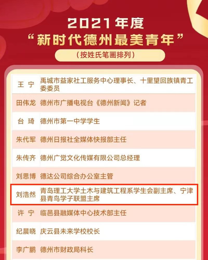 近日,由中共德州市委宣传部、共青团德州市委、德州市广播电视台等部门共同主办的2021年“新时代德州最美青年”评选结果揭晓,临沂校区2019级建筑工程技术专业4班刘浩然作为唯一一名高校学生获得勤学上进类“新时代德州最美青年”荣誉称号。