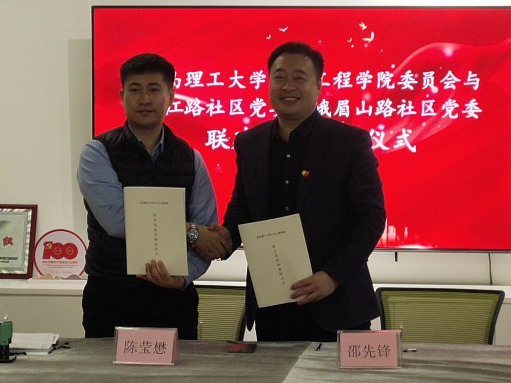 12月22日,土木工程学院与西海岸新区长江路街道办事处峨眉山路社区、三江路社区举行联合党建基地签约仪式在长江路街道办事处峨眉山路社区举行。土木工程学院党委副书记邵先锋、副院长侯东帅、组织员李祥城、长江路街道办事处党工委组织委员牟晓勇主任、三江路社区党委书记陈莹懋、峨眉山路社区党委书记高尧刚出席签约仪式并进行会谈交流。